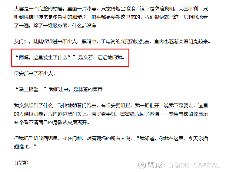 “能在当时的一片昏暗和狼藉中准确地知道我在现场的人,从一开始就在架空层里面。”我说,“如果没猜错,林董一开始也在现场,他的逃离是为了引开我,但他没想到,我留在了架空层里面。因此,他后来又跑回来。无意中听到你讲了一句有破绽的话,他马上说要报警来转移所有人的注意力。他真的是一个忠实的傀儡……”